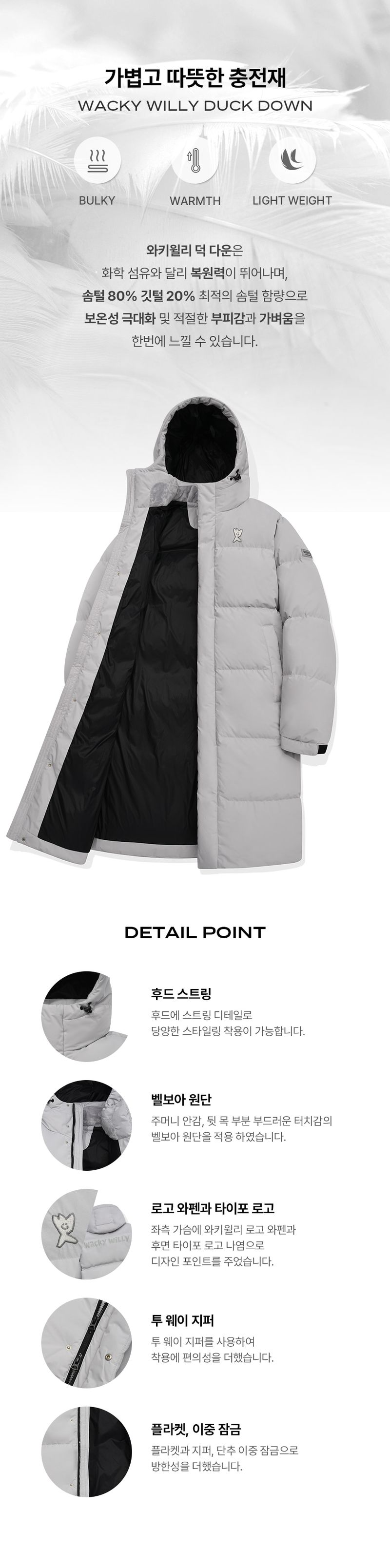 韓國直送 WACKY WILLY - Logo Wappen Hood Long Down Jumper Light Grey